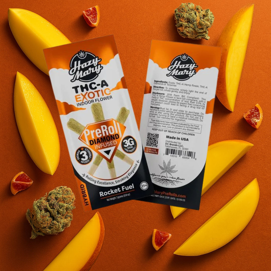 This one’s built to launch. Rocket Fuel fuses heavy hybrid potency with a diesel-kissed flavor that hits fast and sticks around. With THC-A diamond infusion and 1g of premium flower per roll, this trio packs serious lift-off with a smooth, punchy ride from start to finish.
